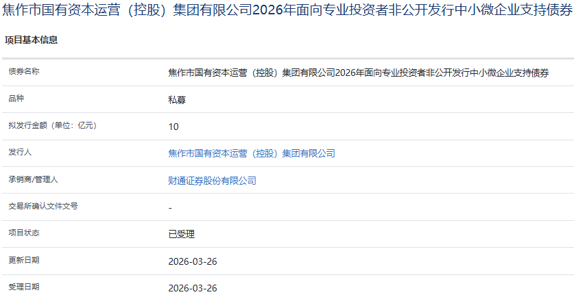 【大河财立方消息】3月26日,焦作市国有资本运营(控股)集团有限公司2026年面向专业投资者非公开发行中小微企业支持债券项目获上交所受理。债券拟发行金额10亿元,承销商/管理人为财通证券。2025年9月23日,经东方金诚综合评定,发行人主体信用评级为AA+,展望稳定。